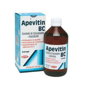 Apevitin bc é um produto eficaz e em perfeito equilíbrio. Associa o primeiro estimulante do apetite clinicamente comprovado à quantidades suplementares de vitaminas do Complexo B e da Vitamina C. Pode ser administrada numa só tomada diária. Produz no apetite da maioria dos pacientes efeitos específicos, uniformes e reproduzíveis. Aumenta o apetite e a ingestão de alimentos, c/ aumento do peso como conseqüência natural. Não se tem relatado retenção de líquidos. Usualmente pode esperar-se que o aumento de peso se inicie após uma semana de tratamento.