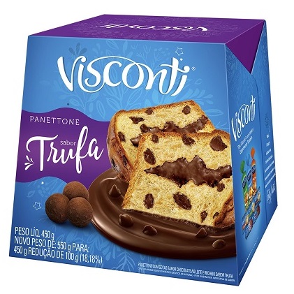 Massa tradicional de panettone com gotas sabor chocolate ao leite e recheio sabor trufa.